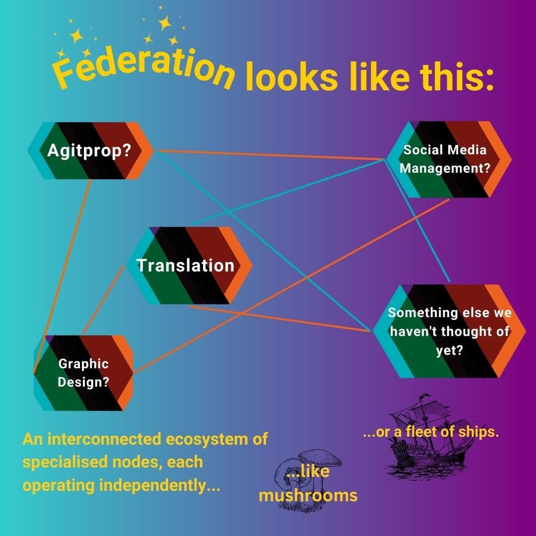 Big picture, we're quite excited to be federating. It's a sustainable form of economic growth, one that allows an organisation to expand without the need for hierarchical, centralised control. Under a federated model, resources (in our case clients, branding, networks) are shared as and when they need to be shared, not based on the whims of some power-drunk fat cat conglomerate overlord or distant, faceless committee.